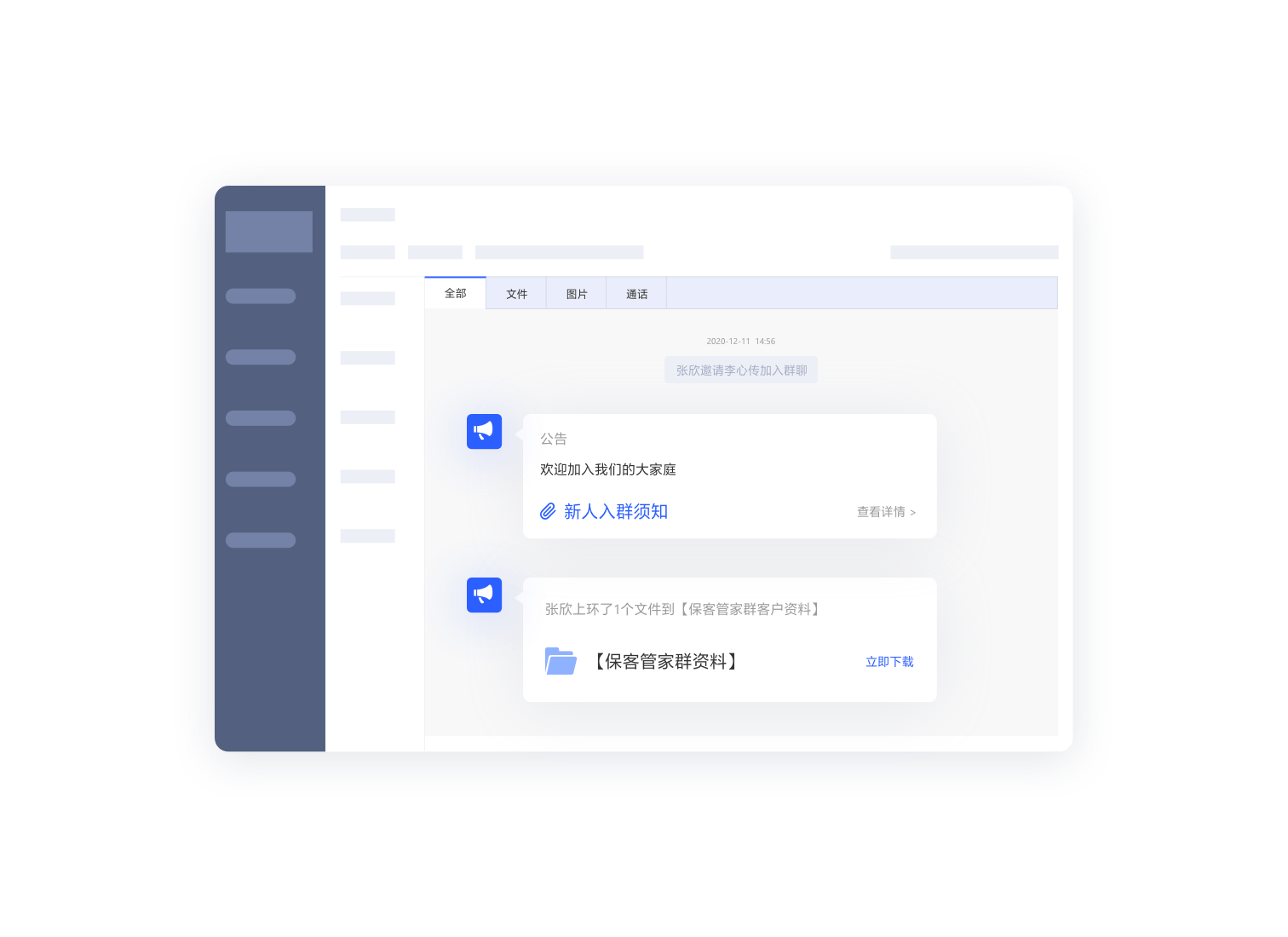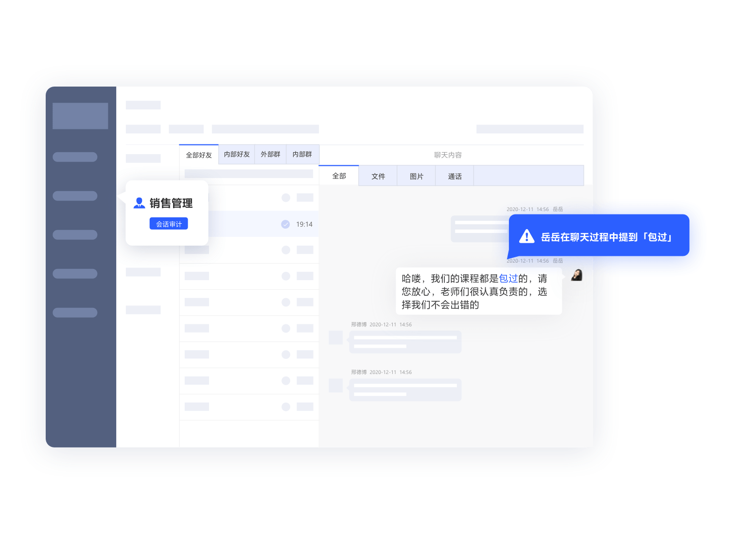 - 管理员统一设置会话存储范围后,可自动获取范围内员工内外部的沟通内容,并按行业要求进行合规存档。